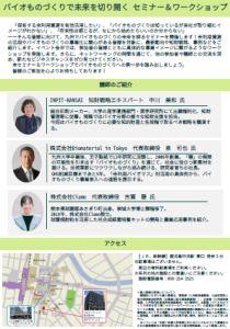 「バイオものづくりで未来を切り開くセミナー&ワークショップ」 にて、代表古賀が登壇いたしました。